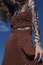 The Desire Skirt is an elegant and timeless piece, crafted in a rich chocolate fabric with satin polka dot texture that subtly catches the light. Its high-rise waist and A-line silhouette create a flattering shape, making it a versatile essential to style for both casual and dressy occasions. A statement basic that brings effortless movement and freshness to your wardrobe.