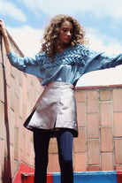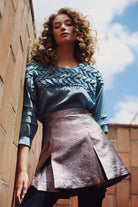 The Roberta Blouse is a sophisticated piece crafted from a lightweight rayon and cotton blend. It features delicate hand-pleated detailing across the bodice, adding texture and uniqueness to the design. The round neckline and 3/4 layered ruffle sleeves create a soft, feminine flow, while the fabric-covered button cuffs provide a refined finish. A versatile blouse that elevates any look.