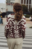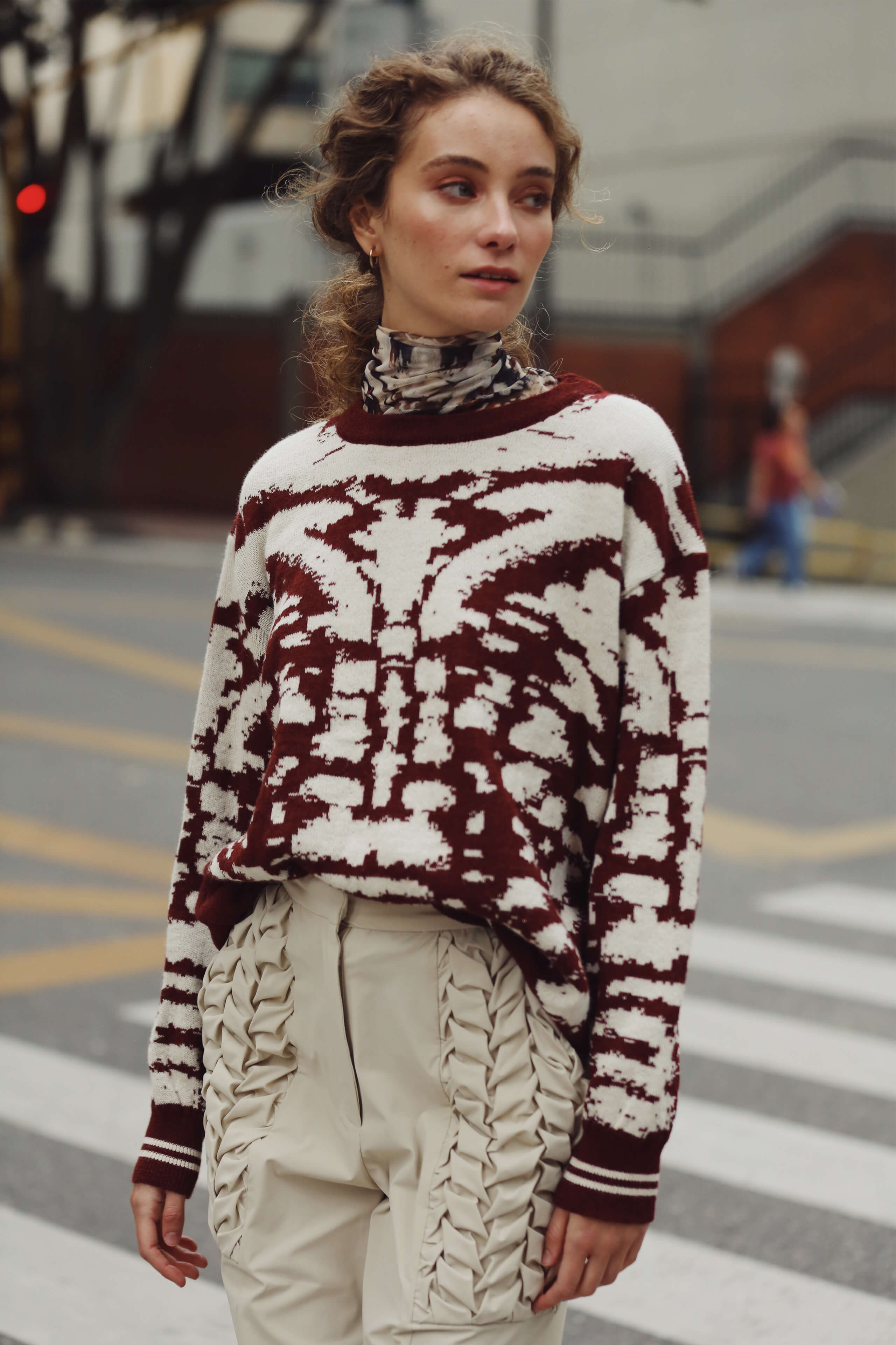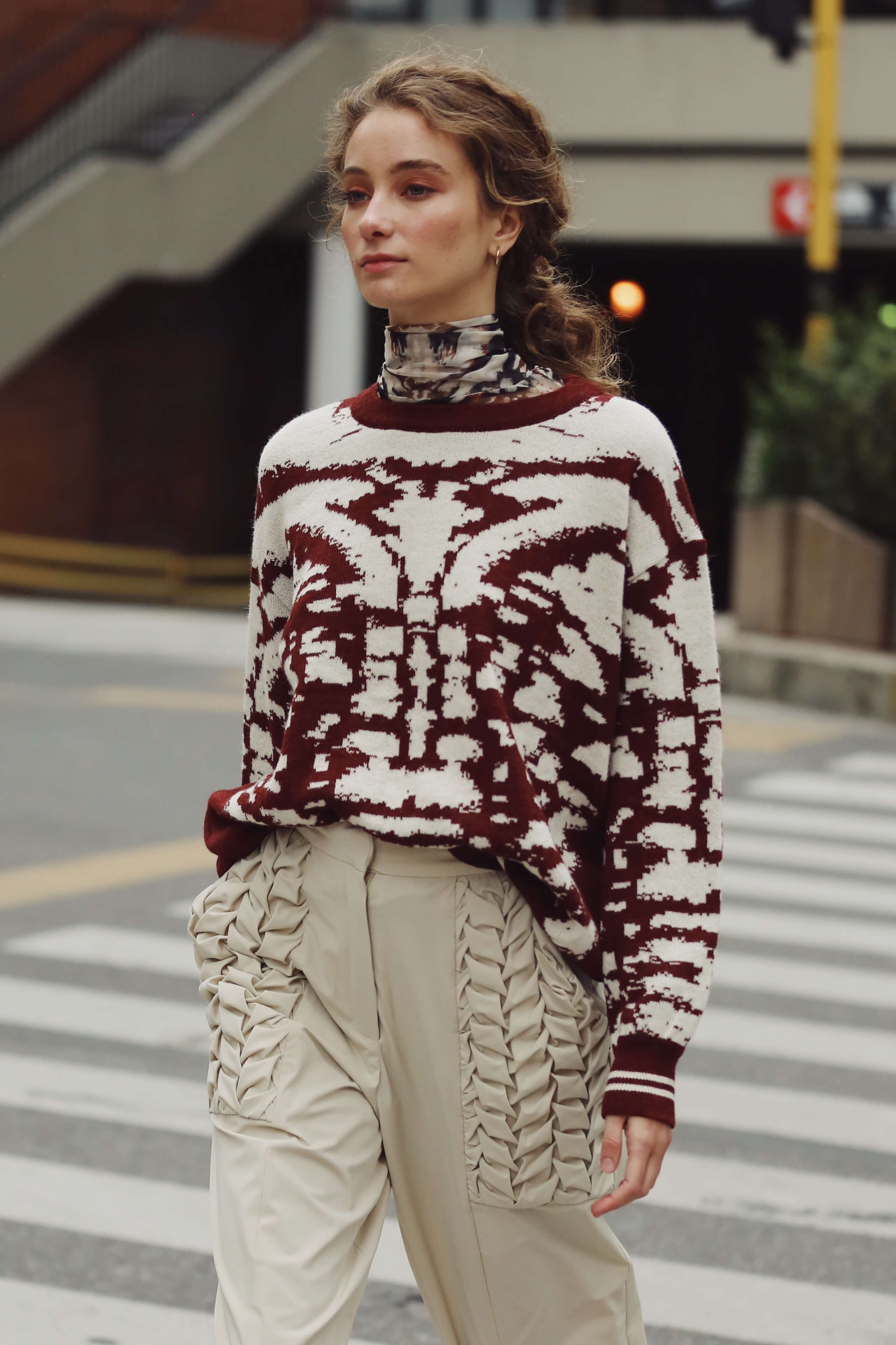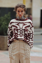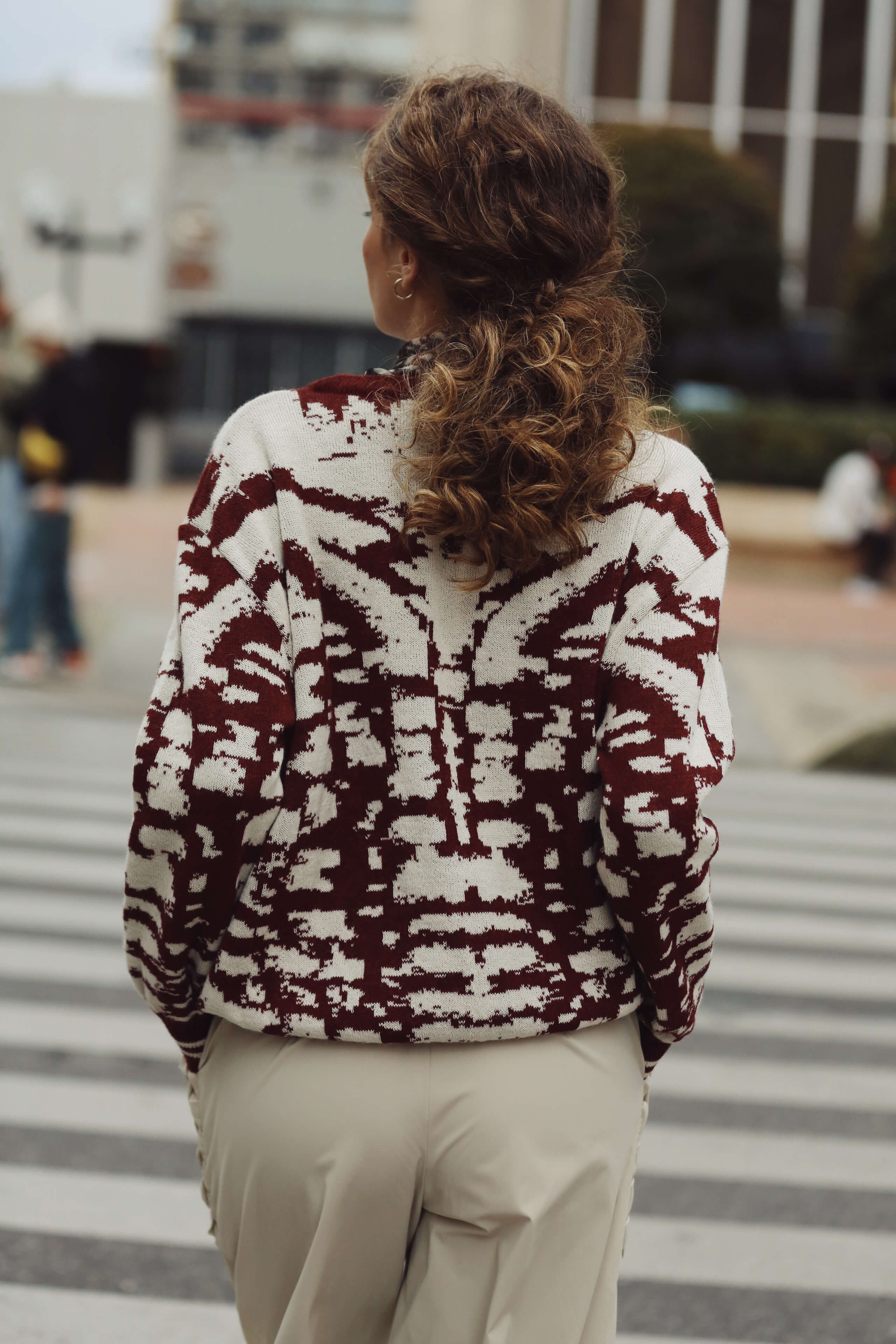 The Fiorella sweater features an abstract brownish red-white and blue-white print with a crew neck, dropped shoulders and long sleeves. Ribbed trims with a striped pattern add a stylish contrast. Designed for a relaxed fit, it offers versatility for layering or wearing on its own with ease.