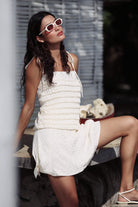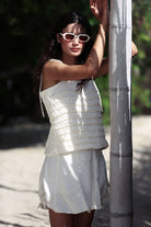 Light, feminine, and summer-ready, the Jessica Skirt is crafted from a delicate rayon-viscose fabric with subtle satin polka dots that catch the light beautifully. Its high-rise, A-line silhouette flatters the figure, while adjustable side ties add a playful and personalized detail.