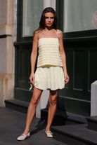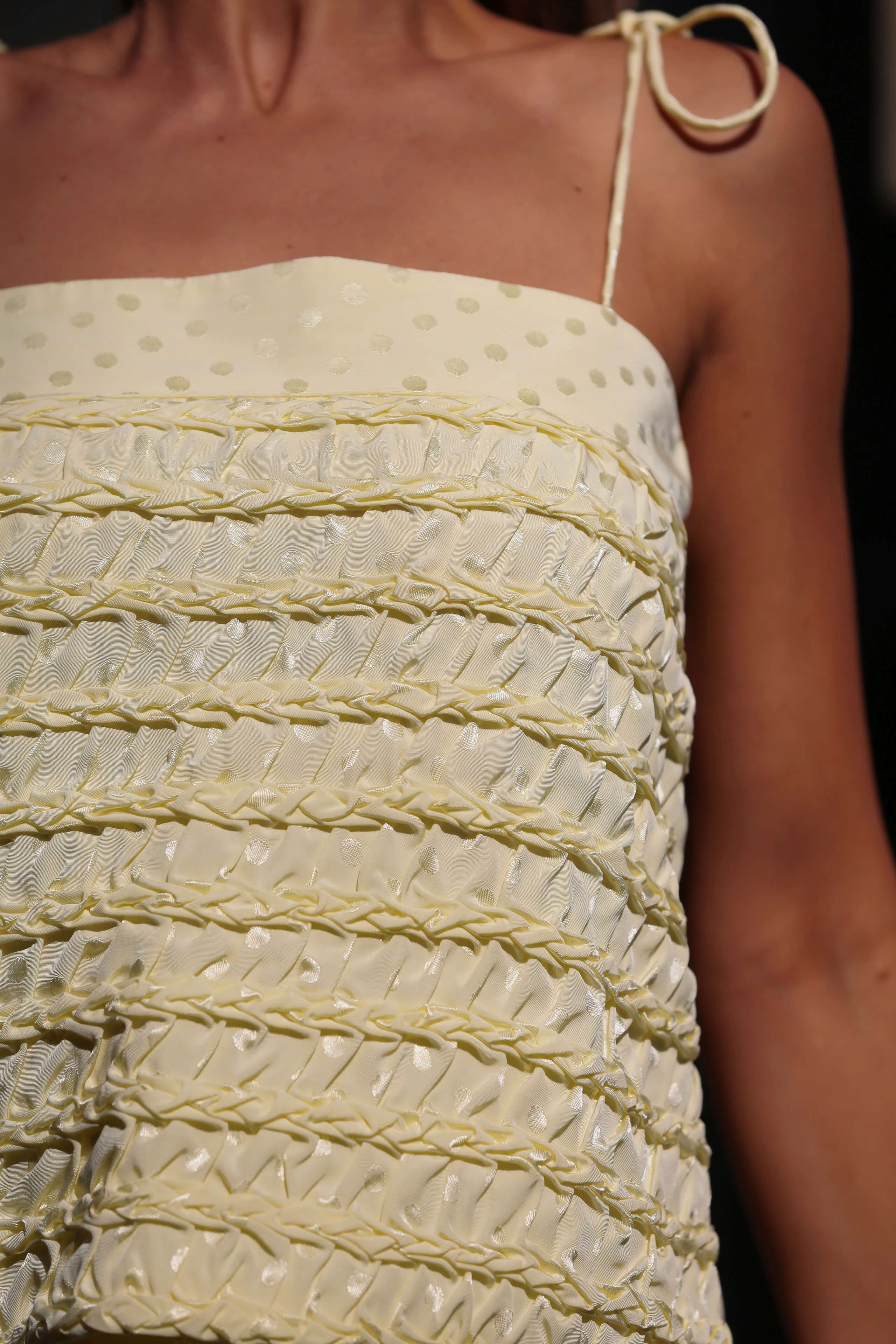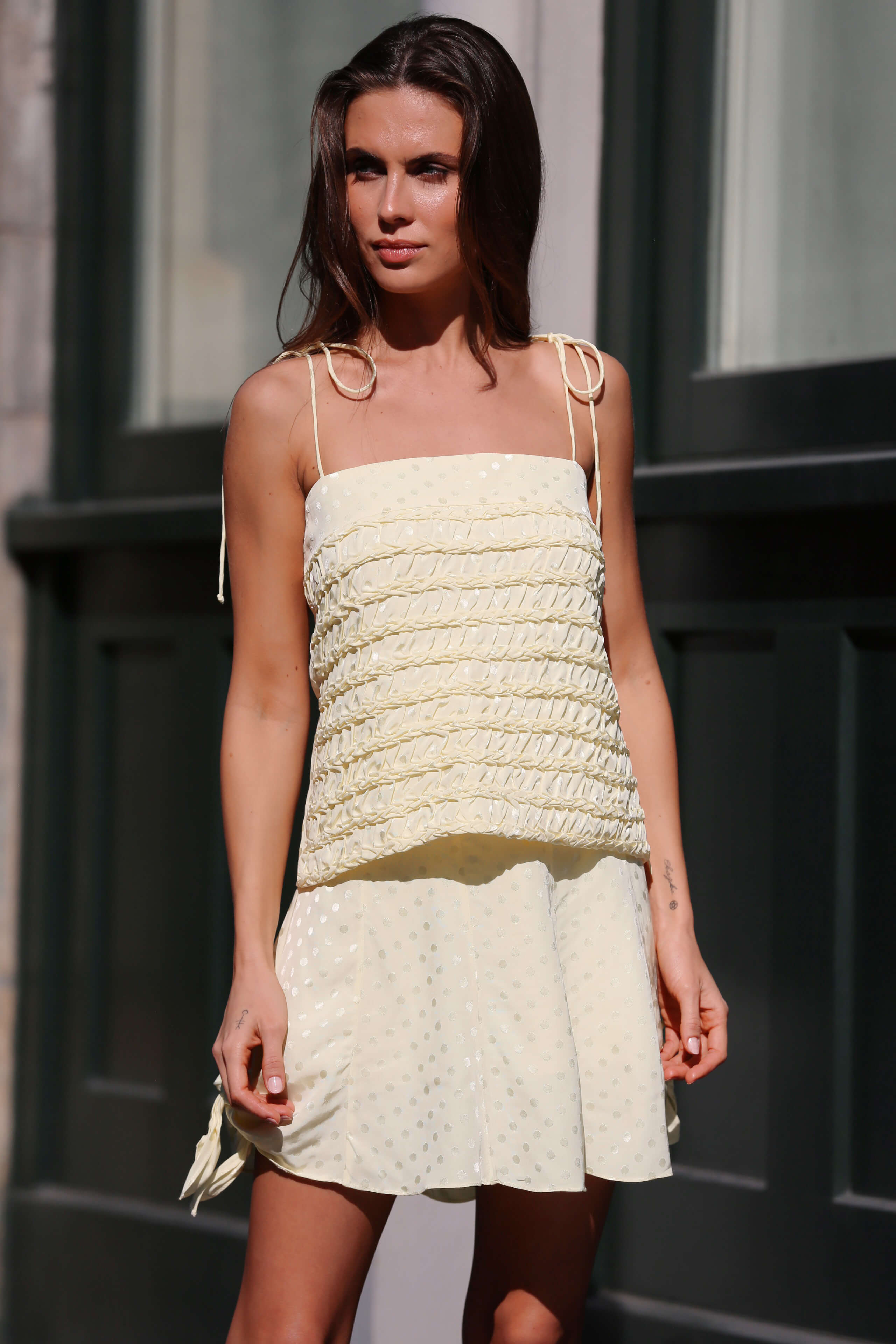 The Xenia Top stands out with its hand-stitched gathered texture on the front, adding an artisanal and unique touch. Crafted from a delicate rayon-viscose blend with subtle satin polka dots, this top exudes both elegance and freshness. The adjustable shoulder ties allow for a customizable fit, while the square neckline and relaxed silhouette ensure comfort and versatility.