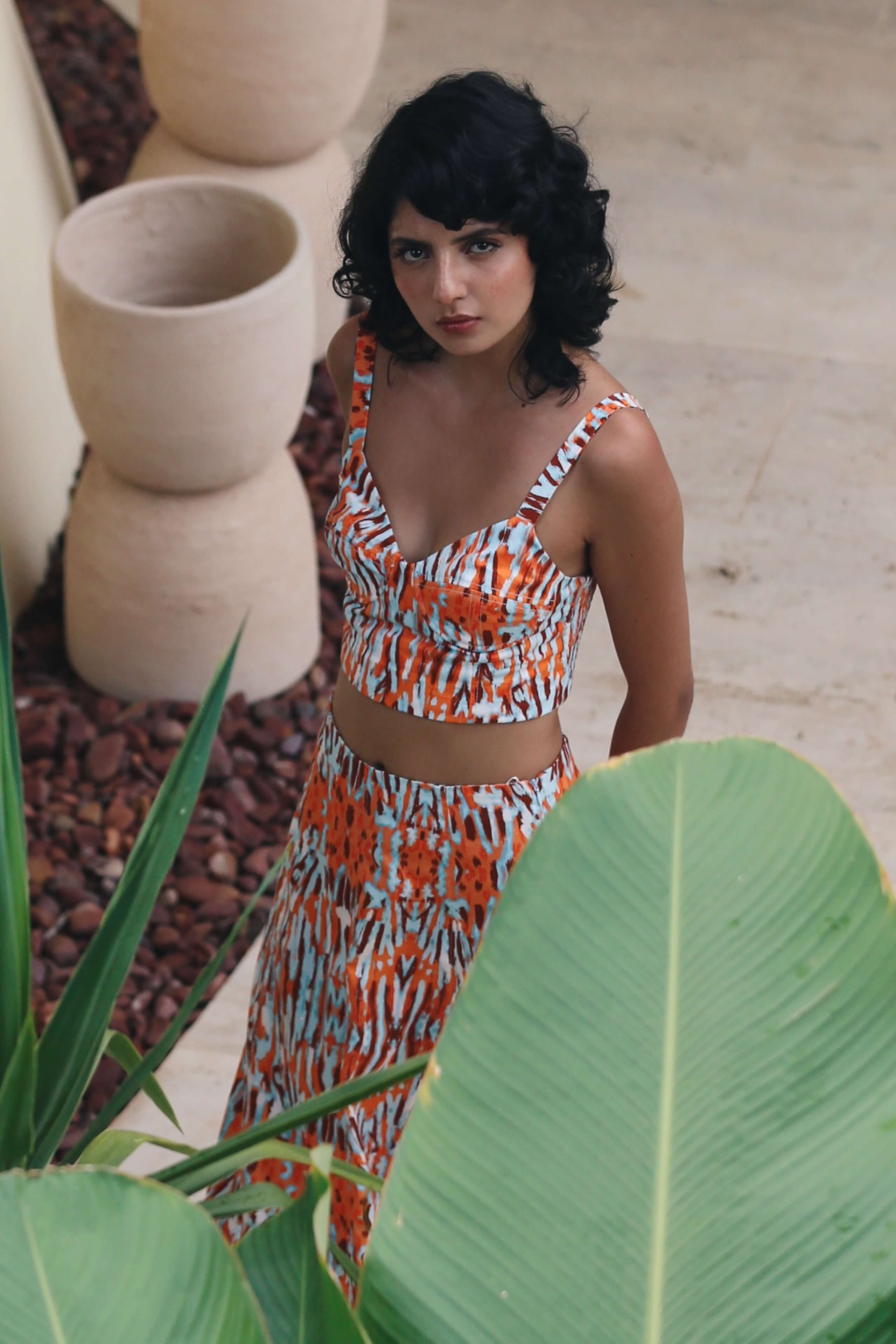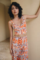 The Bruna Top is a bold and feminine piece crafted from 100% cotton, featuring our exclusive orange signature print. Its cropped bustier silhouette is shaped with a sweetheart neckline. The back features a comfortable elasticated smock detail, and a hidden side zipper adds functionality. A standout top perfect for warm days or elevated styling.