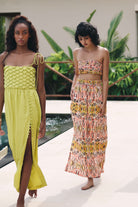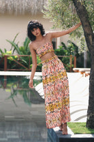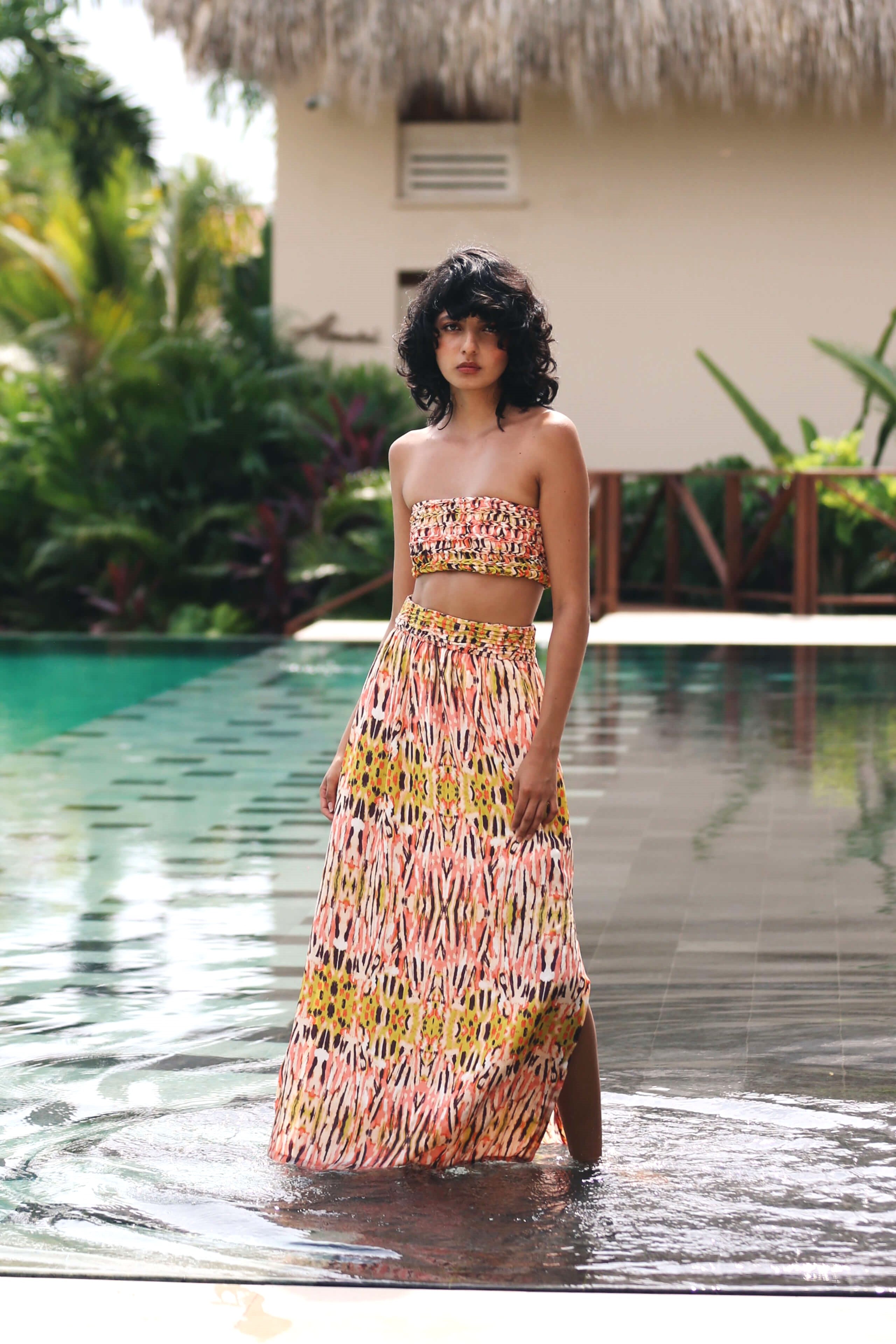 The Victoria skirt blends elegance and vibrancy with its high-waisted design and abstract coral and green print. The "A-line" silhouette flatters the figure, while the wavy pintucks add texture. Perfect for casual occasions, it offers style and comfort.