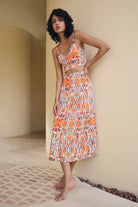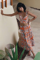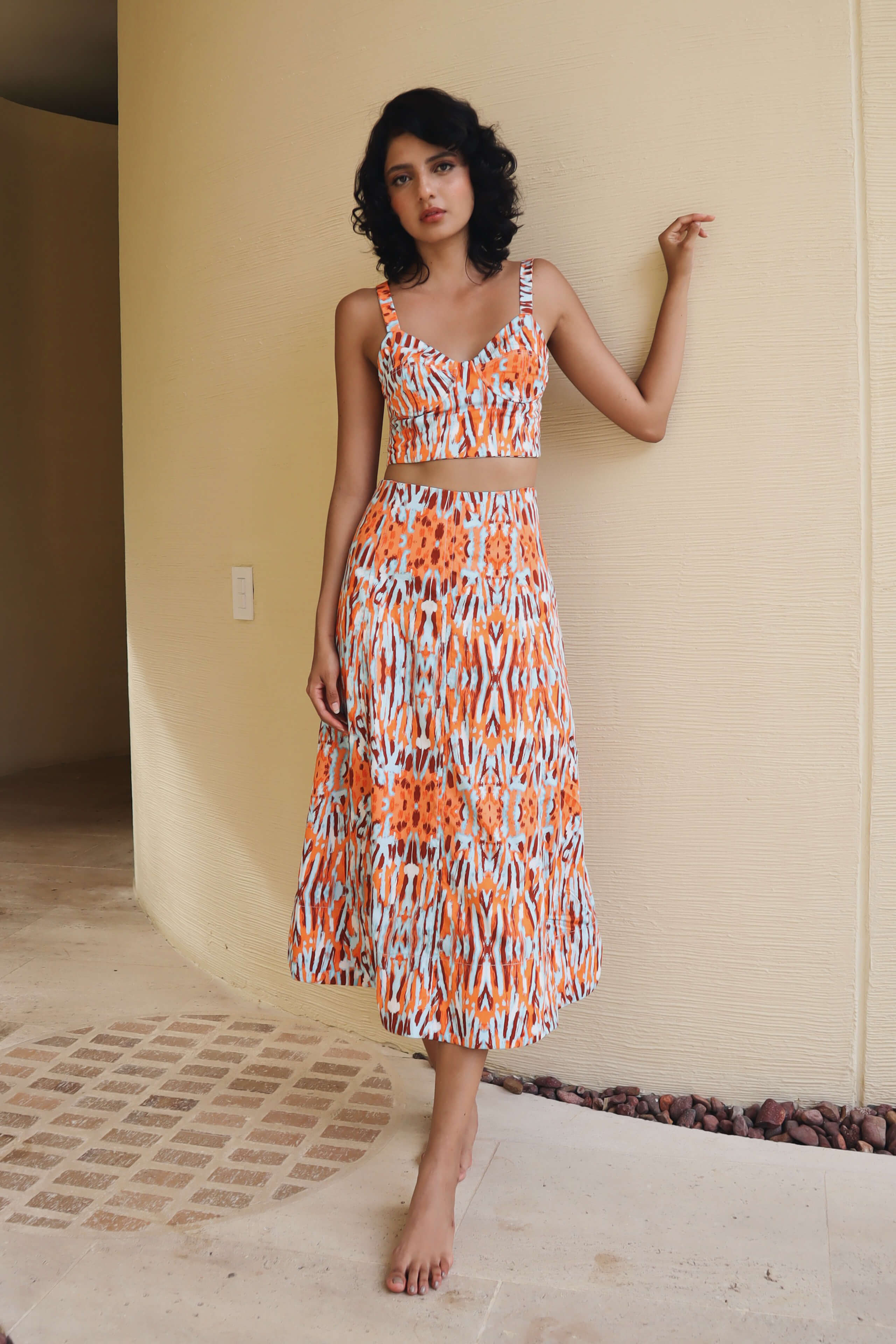 The Cybele skirt stands out for its vibrant orange and blue print, featuring a paneled design that enhances the figure. Its high-waisted cut and A-line silhouette create an elegant, flattering look, while the midi length adds a timeless touch.