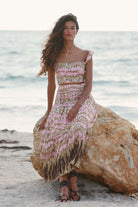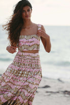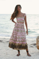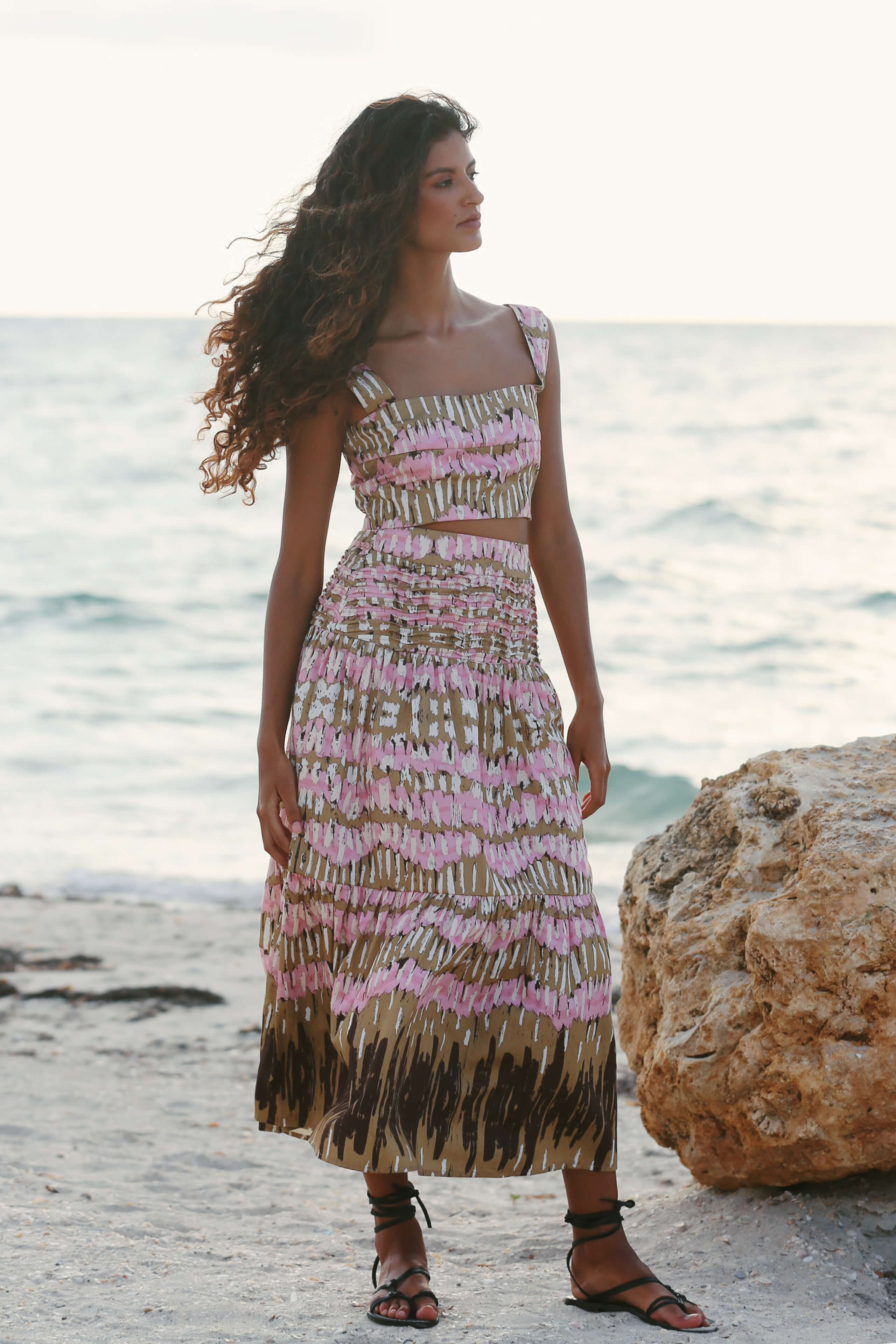 The Diala skirt stands out with its high-waisted design and dropped waistline, accentuating the silhouette. Its charming print in pink and green tones adds a fresh and dynamic flair, while the wavy pintucks provide texture and visual appeal. Ideal for both casual and formal occasions, this long skirt with an A-line silhouette is a versatile piece.
