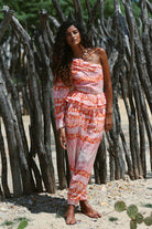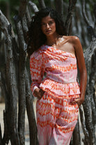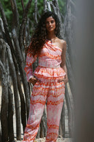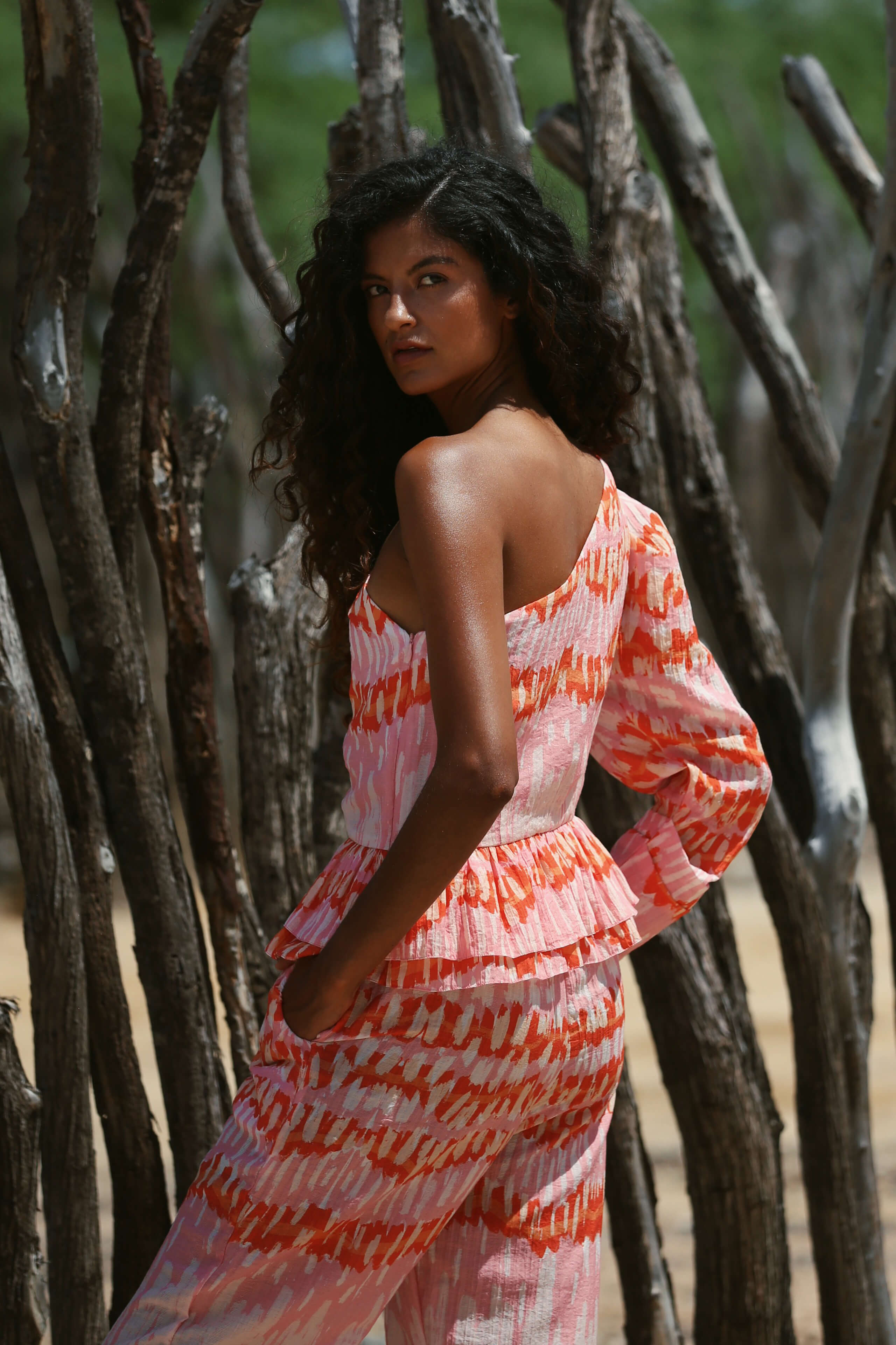 Introducing the Penelope top, featuring a captivating pink abstract print. This unique piece showcases a one-shoulder neckline, one long sleeve, and a stylish ruffled waist.