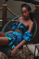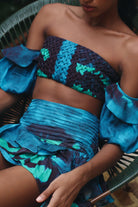 Silvina is an off-the-shoulder crop top crafted in lightweight cotton with a stunning abstract blue-turquoise print. It features a charming handmade smocked front and delicate layered short puff sleeves.