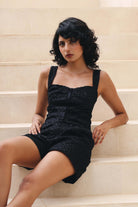 Introducing the Julieta Top, crafted from exquisite textured embroidered cotton in classic black. This top features a buttoned-front style with a semi-sweetheart neckline, complemented by a pointed front hem for a modern touch.
