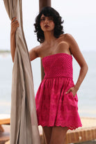Introducing the Agustina dress, a captivating piece crafted from top-quality embroidered cotton with a strapless neckline. Its handmade smocked bodice creates a texture-rich allure. The mini length, fitted bodice and delicate scalloped embroidered hem add a romantic touch.